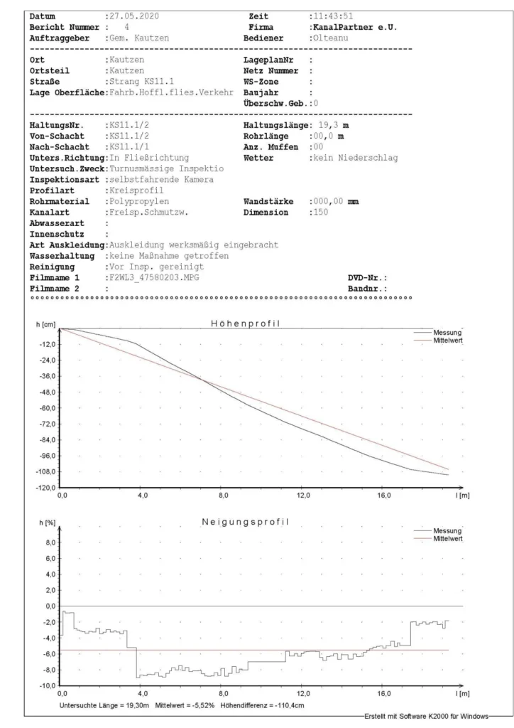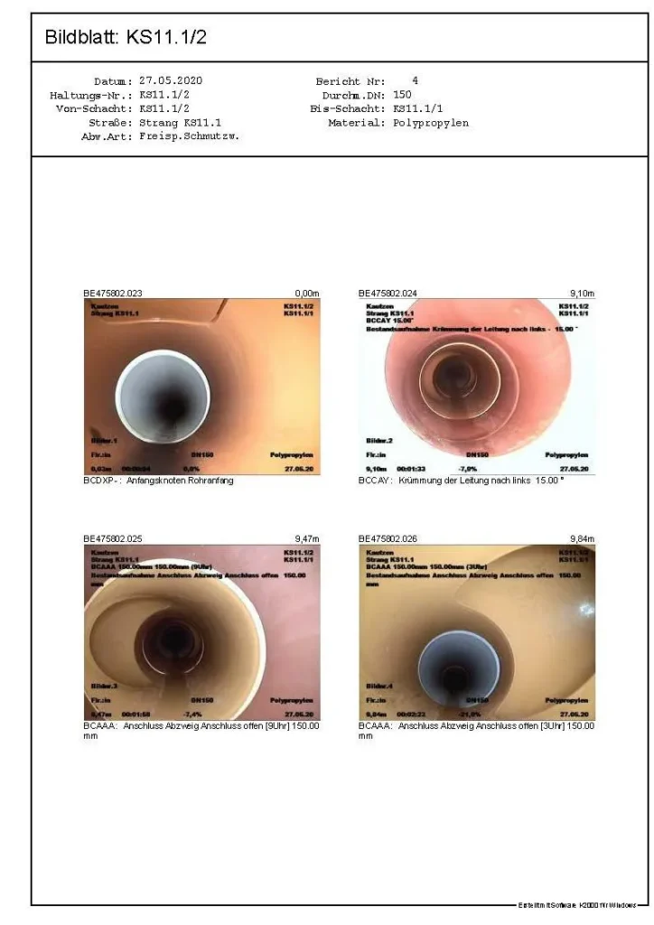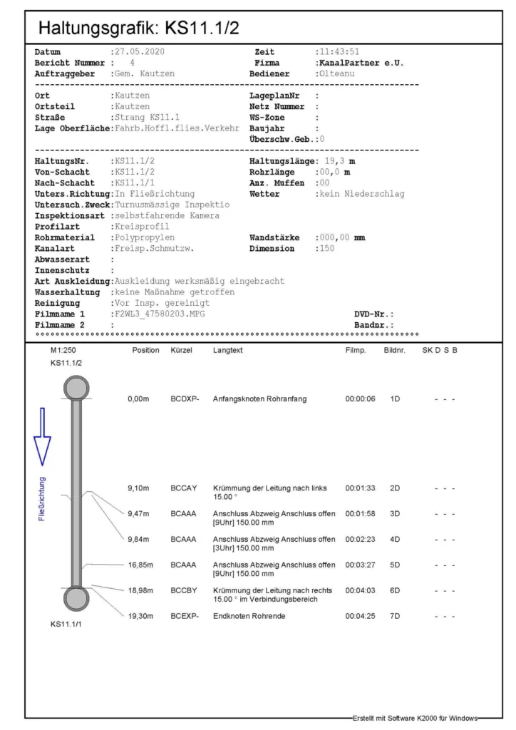 Resultat jeder TV-Inspektion ist eine aussagekräftige Dokumentation auf neuestem technischen Standard und höchstem Qualitätsniveau laut ATV-M143/Isybau sowie EN13508-2/ÖWAV RB43 Als Erfassungssoftware wird K2000 V10 verwendet.